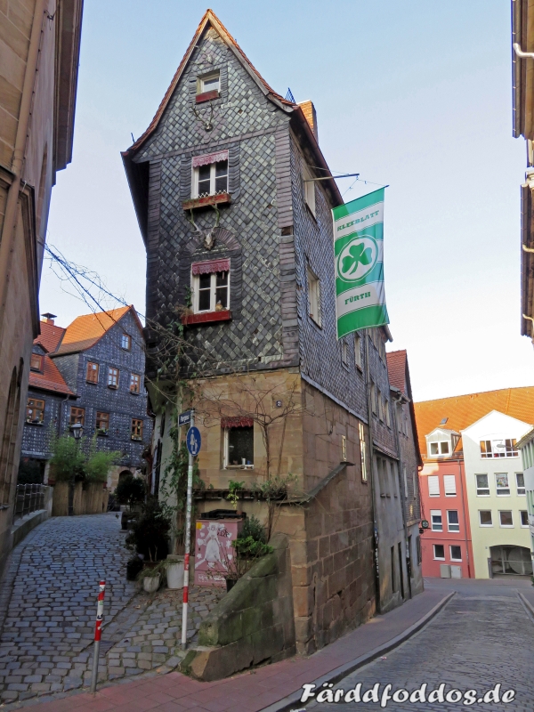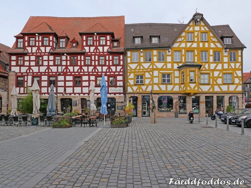 Farbenfrohe Fachwerkhäuser am Grünen Markt in der Fürther Altstadt.