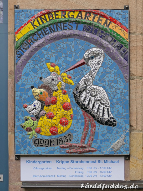 Das Mosaikschild am Eingang des Kindergartens Storchennest am Kirchenplatz in der Fürther Altstadt kann fast schon als kleines Kunstwerk durchgehen.